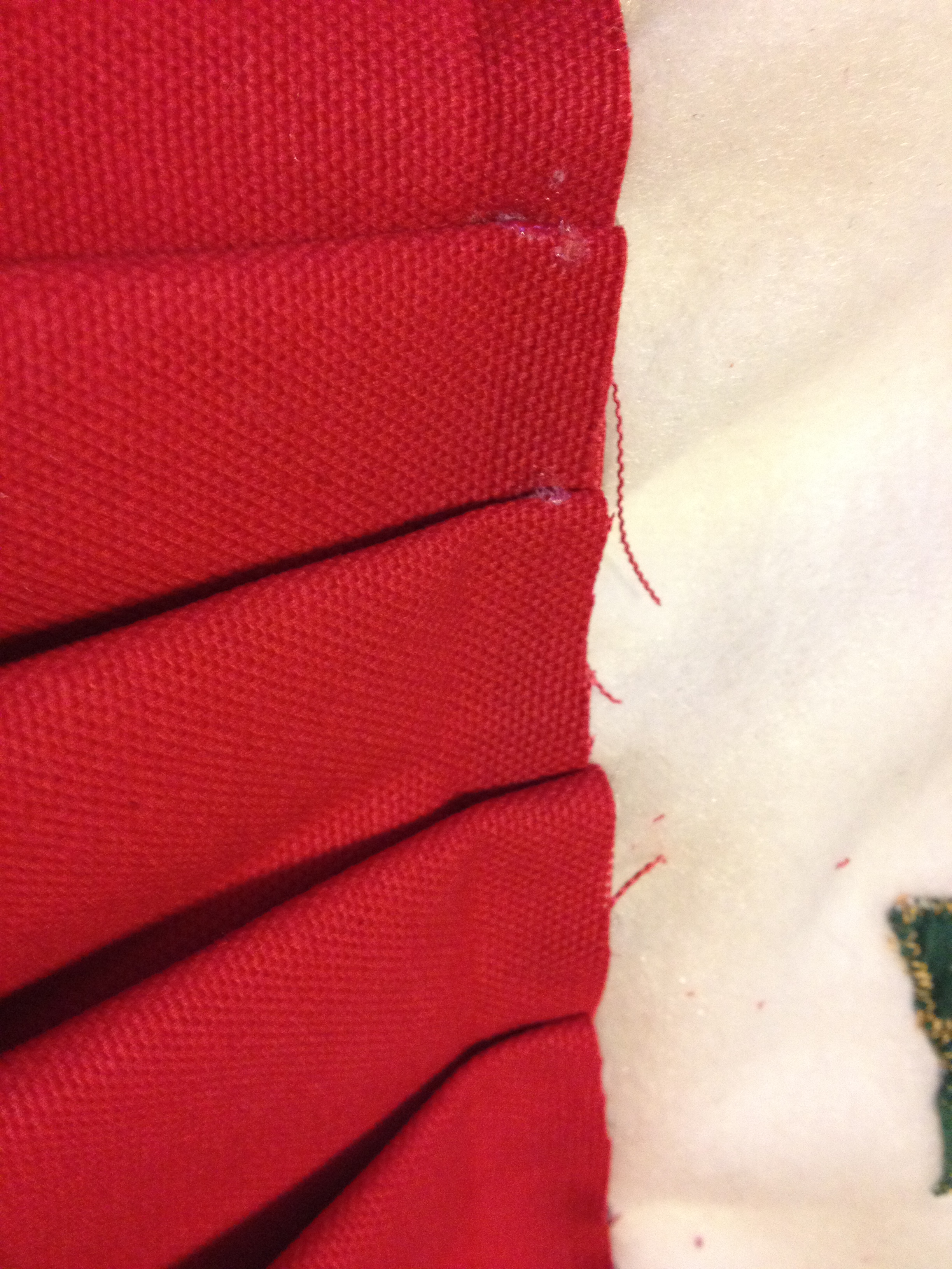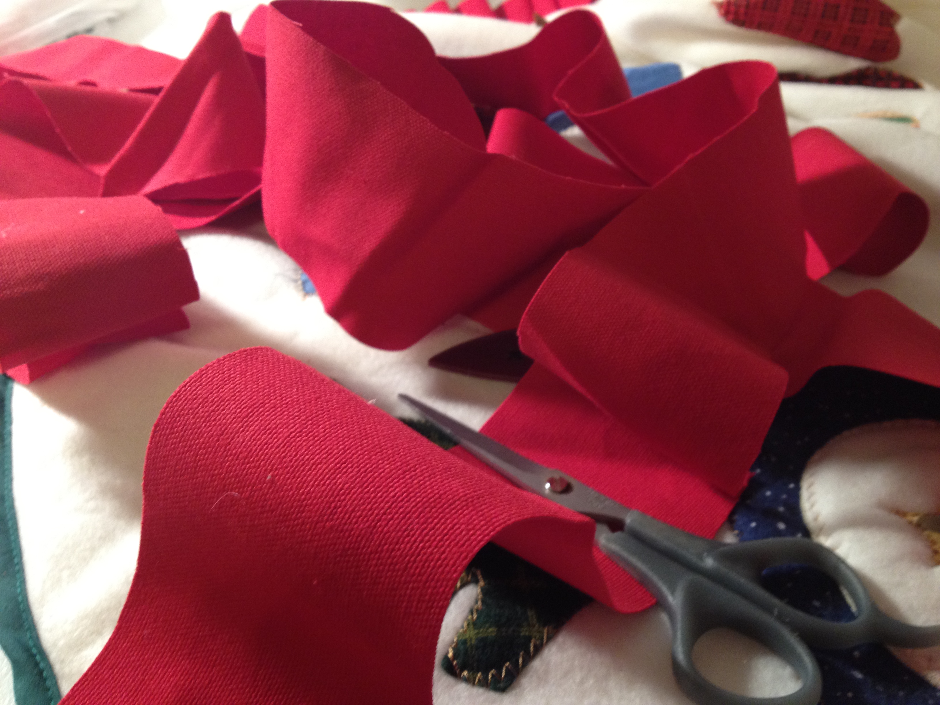 Making progress – When I was almost done, I realized I could rip the red fabric pretty easily for the strips…Which gave it a less defined edge, I liked it better. If I did it again I’d rip all the red.