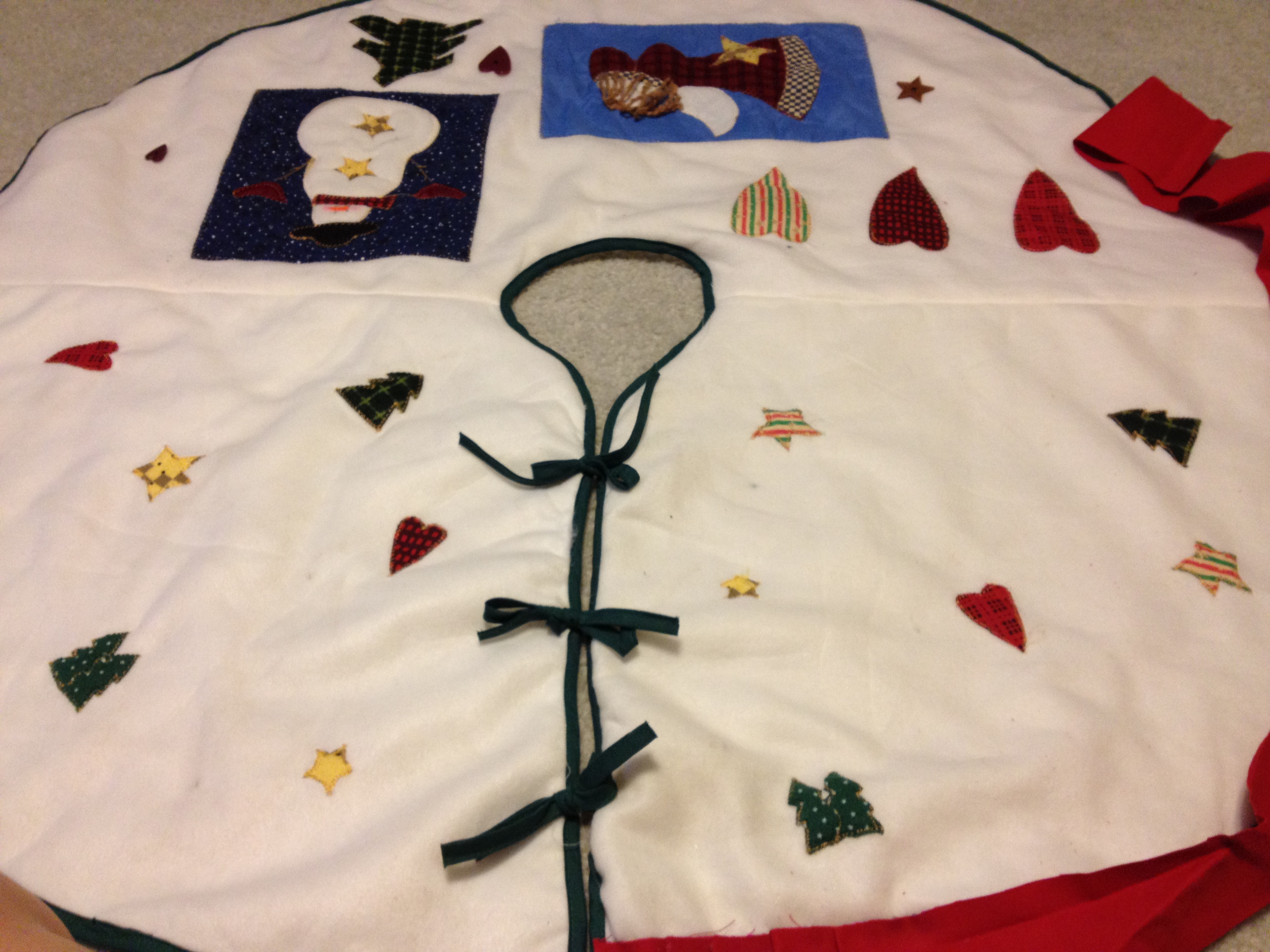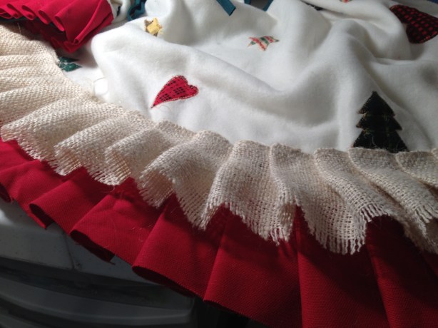 Plus, with the no-sew instructions, it was great for me! (Someday I will get a sewing machine…!) I had been debating for a while to sell my burlap aisle runner, or use it for projects.. Since it’s all the rage right now. I mean… 25 yards of burlap, I could do some damage with that. I decided to keep it, and turn it into decorations. This tree skirt was my first Project. I’m going to see how much I can make out of this aisle runner. Here’s how the tree skirt turned out!