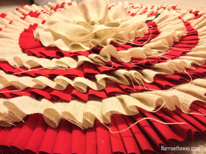 The finished product! I wanted the inside lap to be a little higher, so I pulled a string in the burlap to ruche it around the small circle.