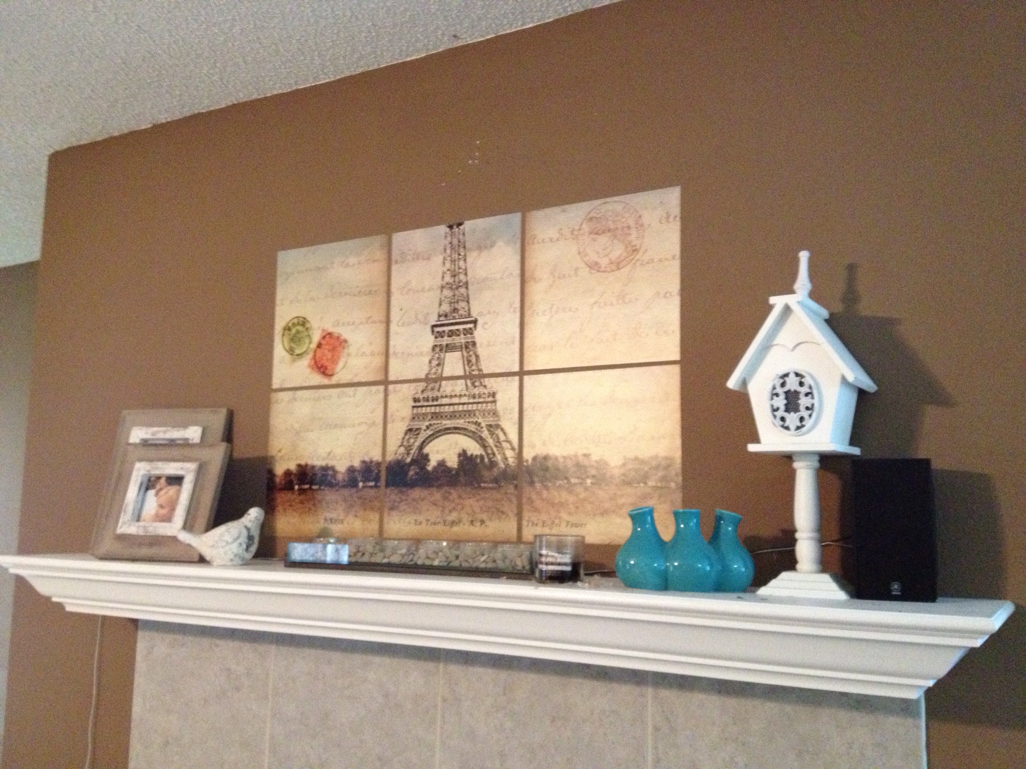 1. Living Room Mantel: We’re planning to paint the downstairs a light beige, I’m tired of being in this hot cocoa colored room! I had that stick on Eifel tower because it was cheap and cute – but it got destroyed over Christmas when I took the top three off. A mirror doesn’t work on it, it just reflects the ceiling fan, not cute. The mantel is pretty high, so it’s a little bit awkward. I am planning to get a big frame for one of our wedding photos.